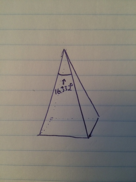 Description: I need a joint to insert four PVC pipes (or other dowels) into. The purpose is to make it easy to make a pyramid frame. The angle from one corner of the pyramid at the apex to an adjacent corner needs to be about 16.3 degrees.