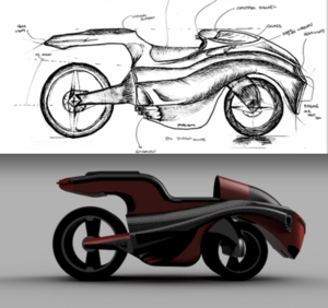 An aerodynamic concept bike, inspired by a mix of future trends and aerodynamic design. The bike is aimed to be extremely lightweight, with most of its components of carbon fiber, and has an extremely powerful engine air fueled by two large side intakes. |