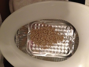 Want a custom size basket that fits within a toilet bowl and suspends on the toilet edge. Does not sit in the water. Basket holes must be small enough to not pass the pellets in the basket. Cat pee should pass thru. I will scoop out the poop. |